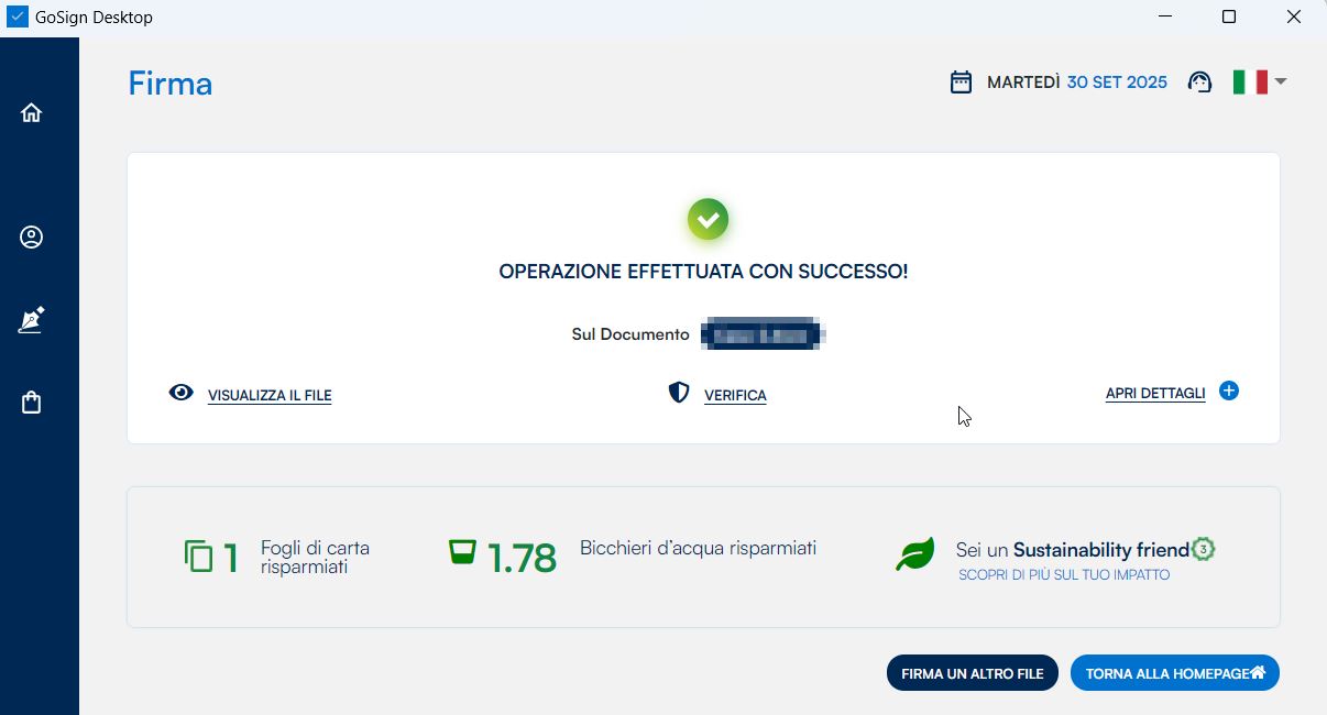 Al termine della procedura, il software GoSign Desktop mostrerà una notifica di conferma dell’avvenuta firma digitale. Cliccando sul tasto VERIFICA sarà possibile effettuare la verifica della firma appena apposta.