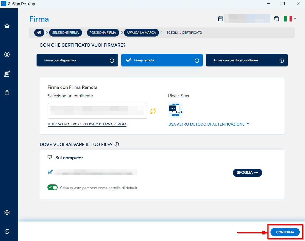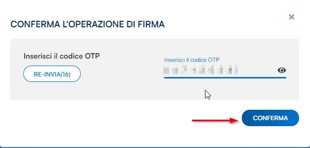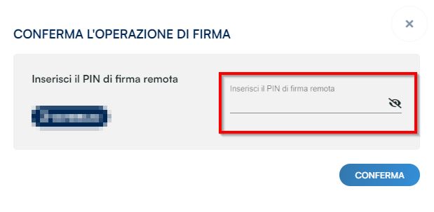 Verrà richiesto di inserire il codice PIN di firma remota e cliccando CONFERMA nella schermata successiva si dovrà inserire l’OTP, un codice numerico ricevuto tramite SMS sul numero di cellulare associato al certificato di firma o tramite notifica qualora fosse configurata sul Gosign Mobile.