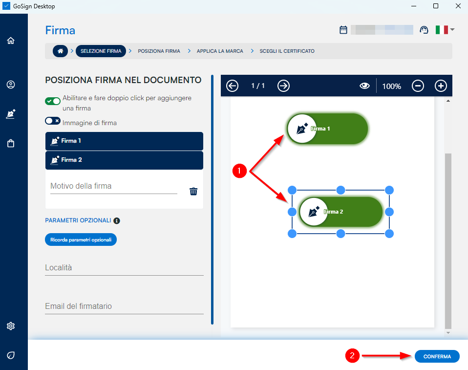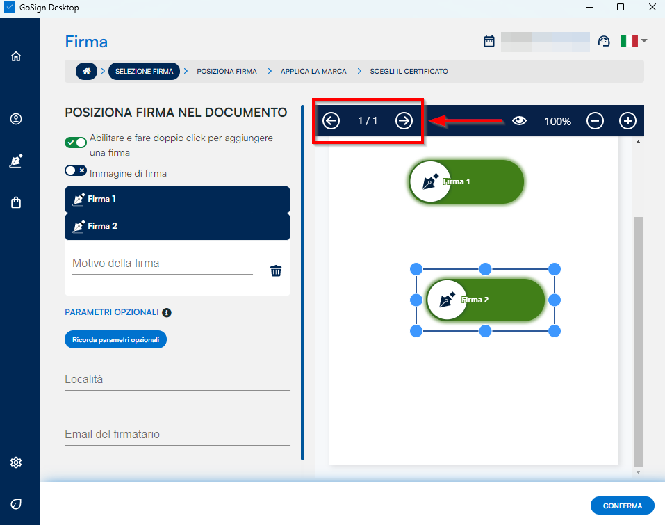 Se invece si desidera apporre la firma su un’altra pagina del file caricato, vedi figura 2, sarà necessario prima cambiare la pagina cliccando sull’icona della freccia presente in alto a sinistra dell’anteprima del documento e ripetere nuovamente l’operazione sopra indicata. Al termine dell’apposizioni delle firme, cliccare su CONFERMA (2) presente in basso a destra.