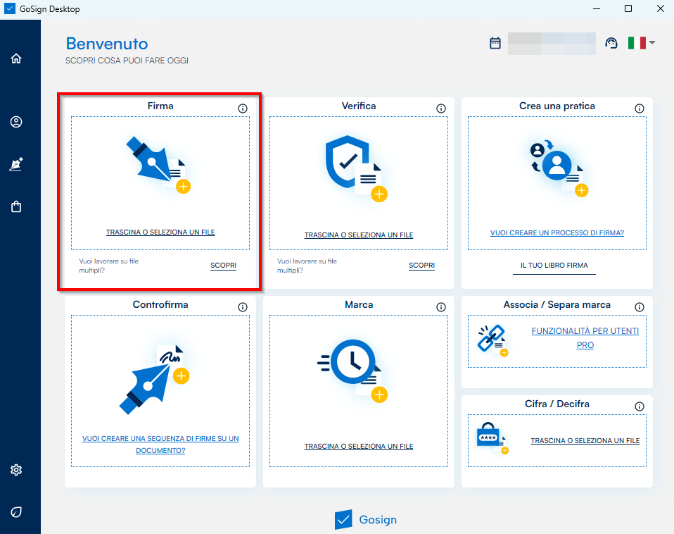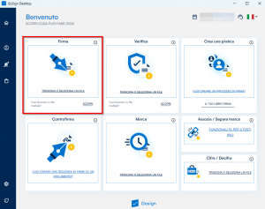 Dalla home page del programma cliccare sull’icona rinominata TRASCINA O SELEZIONA UN FILE sotto la funzione FIRMA.