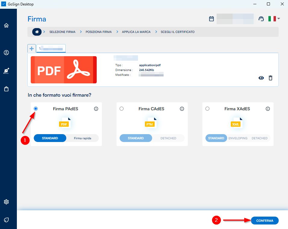 Selezionare un file in formato PDF dal proprio computer e spuntare su Firma PAdeS (1) e cliccare su CONFERMA (2) in basso a destra.