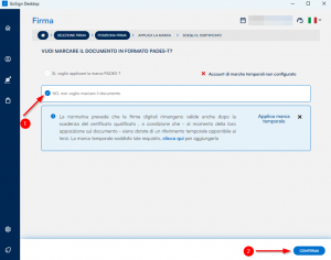 Selezionare, qualora non lo fosse già, la dicitura “No, non voglio marcare il documento” (1) e proseguire cliccando su CONFERMA (2) in basso a destra. Il GoSign Desktop visualizzerà il certificato di firma remota e cliccare su CONFERMA.