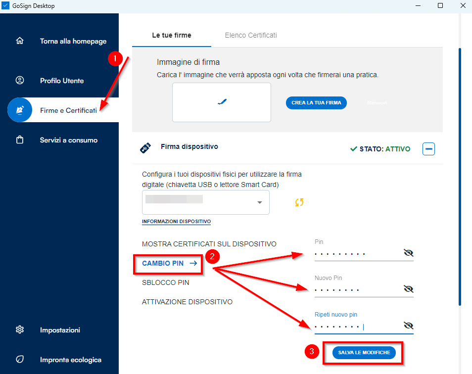 Cliccare sulla voce CAMPIO PIN (2), al centro della pagina indicare nella sezione PIN il codice attualmente usato, nel campo NUOVO PIN inserire un nuovo codice che dovrà essere esclusivamente composto da 8 numeri e ripeterlo nella sezione RIPETI NUOVO PIN. Infine, cliccare su SALVA LE MODIFICHE (3).