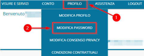 Dopo aver effettuato il login con le proprie credenziali, cliccare sulla voce PROFILO (1) presente nel menù orizzontale in alto e, nel sotto elenco, MODIFICA PASSWORD (2):