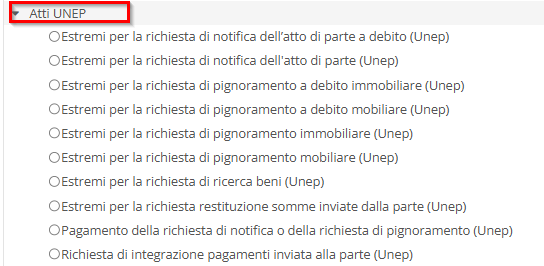 Nella lista degli atti disponibili, selezionare la tipologia di atto sotto la categoria Atti UNEP quindi cliccare su Avanti per procedere con la compilazione guidata del deposito