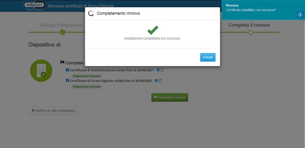 Per completare il rinnovo e scaricare i nuovi certificati sul dispositivo si seleziona il pulsante completa rinnovo. Se in precedenza sono stati selezionati per il rinnovo entrambi i certificati, questi verranno rinnovati in un unico passaggio. Cliccando su procedi verrà richiesto di nuovo il pin e scaricati i certificati sul dispositivo.