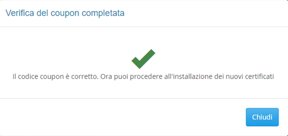 Alla schermata successiva si dovrà inserire il codice coupon. Dopo la verifica positiva dello stesso sarà possibile procedere con l’installazione dei certificati sul dispositivo.
