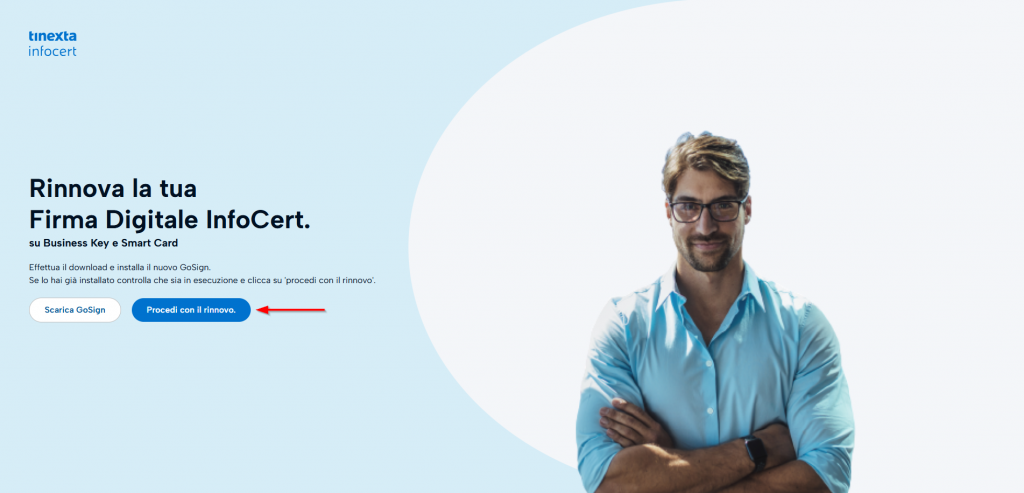 Cliccare sul link all’interno dell’e-mail stessa dove si verrà riportati alla pagina del rinnovo: https://rinnovofirma.infocert.it/dike-web-renew-ui/renew/?ui=lextel#/welcome