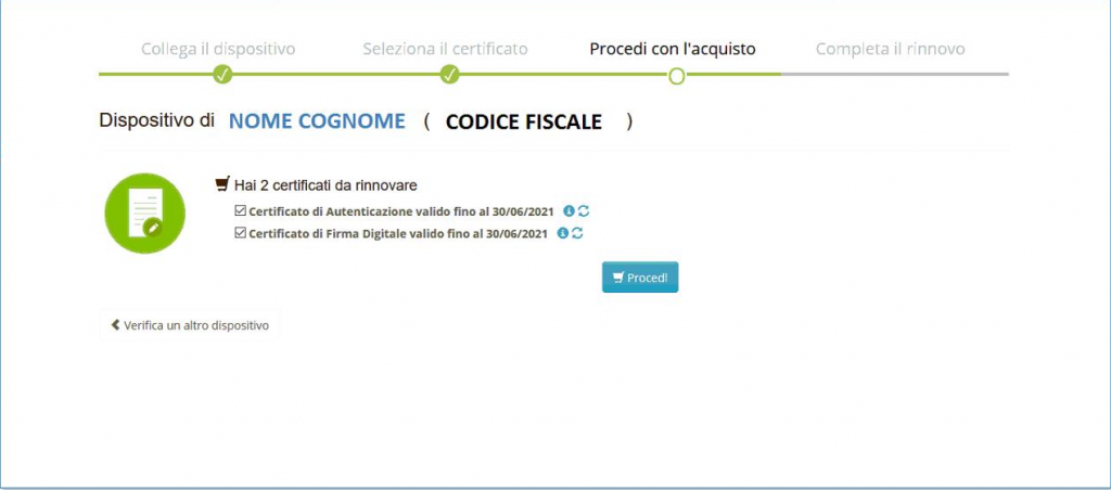 e cliccare su Procedi con il rinnovo figura 1. Verrà automaticamente eseguita la lettura dei certificati, che verranno mostrati come in figura 2. Nel caso di doppio certificato andranno selezionati entrambi. Il click sul pulsante Procedi genera una richiesta di rinnovo e verrà richiesto il pin del dispositivo.