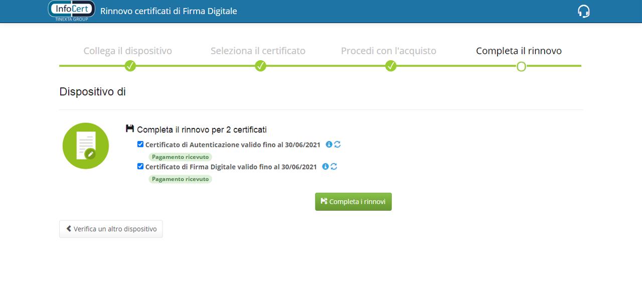 Per completare il rinnovo e scaricare i nuovi certificati sul dispositivo si seleziona il pulsante completa rinnovo. Se in precedenza sono stati selezionati per il rinnovo entrambi i certificati, questi verranno rinnovati in un unico passaggio. Cliccando su procedi verrà richiesto di nuovo il pin e scaricati i certificati sul dispositivo.
