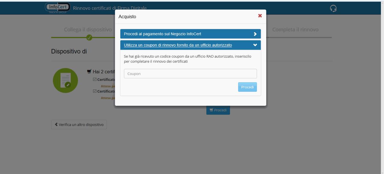 Alla schermata successiva si dovrà inserire il codice coupon. Dopo la verifica positiva dello stesso sarà possibile procedere con l’installazione dei certificati sul dispositivo.