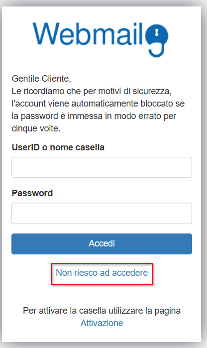 Collegarsi al sito di accesso alla webmail e cliccare in basso su “Non riesco ad accedere”