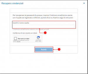 Si aprirà la schermata del “Recupero credenziali” in questa sarà necessario inserire la user-id della casella PEC o l’indirizzo della stessa (1), spuntare la voce “Non sono un robot” e poi andare “Avanti” (2).