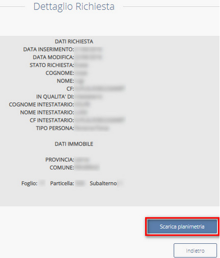 A video si visualizzeranno i dati inseriti per la richiesta della Planimetria, cliccando sul SCARICA PLANIMETRIA, si potrà effettuare il download del PDF della stessa sul proprio computer: