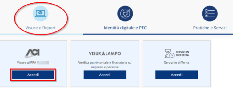 Dopo aver effettuato il login con le proprie credenziali, cliccare sulla voce ACCEDI, presente nel riquadro rinominato Visure al PRA nella colonna Visure e Report: