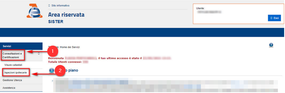 All’interno della banca dati, cliccare sulla voce CONSULTAZIONI E CERTIFICAZIONI (1) nel menù di sinistra e, nel sotto elenco, ISPEZIONI IPOTECARIE (2):