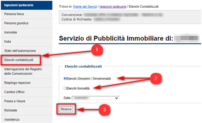 Nel menù laterale di sinistra, selezionare la voce ELENCHI CONTABILIZZATI (1). Qualora, nella ricerca effettuata in precedenza, ci si è fermati alla visualizzazione degli omonimi, selezionare la voce Elenchi Omonimi / Omoimmobili viceversa, qualora ci si è fermati alla visualizzazione delle formalità, sarà necessario selezionare Elenchi formalità (2). Indicare infine la data e infine cliccare su RICERCA (3):