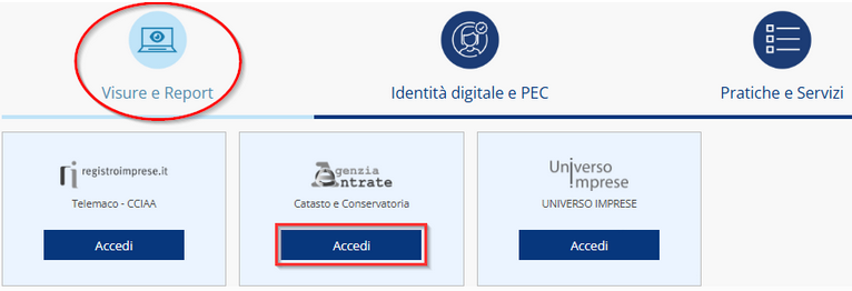 Dopo aver effettuato il login con le proprie credenziali, cliccare sulla voce ACCEDI, presente nel riquadro rinominato Catasto e Conservatoria nella colonna Visure e Report: