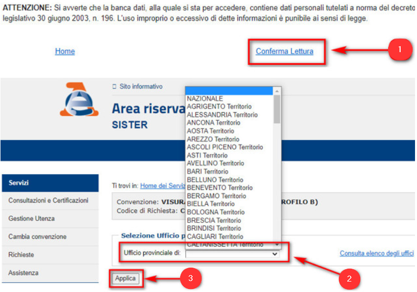 Cliccare sulla voce CONFERMA LETTURA (1) al centro della pagina e selezionare la conservatoria sul quale si desidera effettuare la ricerca e l’estrazione del documento (2):
