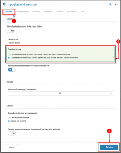 NOTA: In qualsiasi momento è possibile reimpostare la casella nella modalità precedente: basta tornare in Impostazioni, poi in Generale e Configurazione, selezionare “La casella riceve e invia sia da caselle certificate sia da caselle ordinarie” e cliccare su Salva.