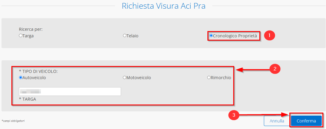 Selezionare la ricerca per CRONOLOGICO PROPRIETA’ (1) e indicare il dato di ricerca (2), infine, cliccare su CONFERMA (3):