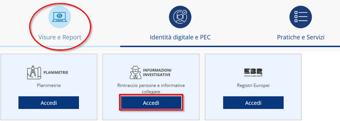 Dopo aver effettuato il login con le proprie credenziali, cliccare sulla voce ACCEDI, presente nel riquadro rinominato Rintraccio persone e informative collegate nella colonna Visure e Report: