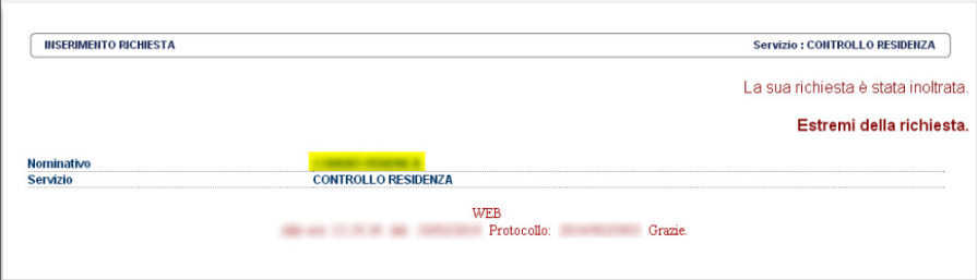 Il sistema mostrerà una nuova schermata riportante gli estremi della richiesta e un messaggio di conferma dell’inoltro: