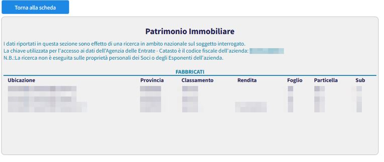 Ogni riquadro include anche un pulsante con tre puntini, che consente di aprire approfondimenti aggiuntivi, se disponibili. Di seguito un esempio di approfondimento relativo al patrimonio immobiliare di una società:
