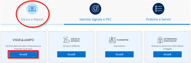 Dopo aver effettuato il login con le proprie credenziali, cliccare sulla voce ACCEDI, presente nel riquadro rinominato Visura Lampo nella colonna Visure e Report: