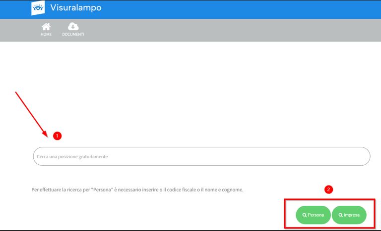 Per eseguire la ricerca gratuita basta inserire la P.IVA/denominazione dell’impresa da ricercare (1) e cliccare sul tasto IMPRESA (2):