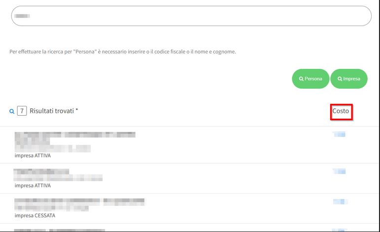 Oltre ai risultati precisi, il sistema propone anche risultati simili per individuare il soggetto corretto. Per ogni risultato sarà visibile in anticipo il costo del servizio, prima di procedere con l’acquisto: