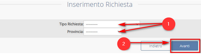 Indicare il tipo di richiesta tra persona fisica, persona giuridica e immobile (1) e la provincia sulla quale si desidera effettuare la ricerca (2):