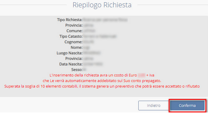 Il sistema mostrerà a video il riepilogo della richiesta. Se i dati risultano essere corretti, cliccare su CONFERMA: