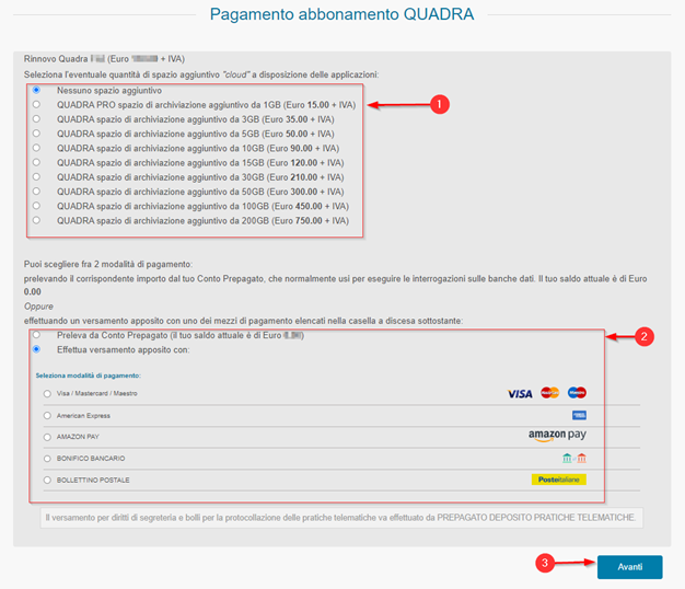 All’avvio della procedura di pagamento, il piano dei servizi scelto sarà già selezionato, è pertanto sufficiente indicare il pacchetto/taglio relativo allo spazio aggiuntivo da acquistare (1), la modalità di pagamento (2) e cliccare su Avanti (3) quindi seguire la procedura guidata a video per finalizzare la procedura.
