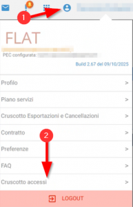 Per visualizzare l’elenco degli accessi effettuati all’interno della propria utenza Quadra, sarà sufficiente effettuare il login all’interno del sito www.accessogiustizia.it e cliccare in alto a destra sulla funzione Profilo (1) – Cruscotto accessi (2)