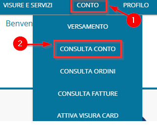 Dopo aver effettuato il login con le proprie credenziali, cliccare sulla voce CONTO (1) presente nel menù orizzontale in alto e, nel sotto elenco, CONSULTA CONTO (2):