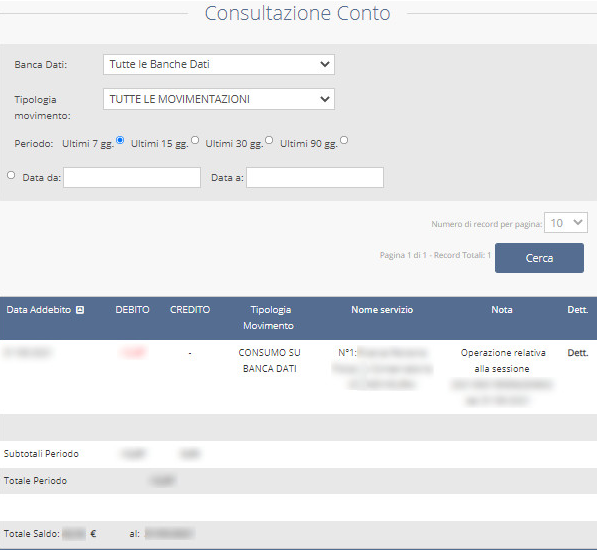 Qualora fosse attivo il solo conto CON IVA, o dopo la selezione del conto prepagato da visualizzare, il sistema mostrerà a video l’elenco degli addebiti avvenuti negli ultimi 7 giorni. Si potrà cambiare il periodo o specificare la tipologia della ricerca usufruendo dei filtri indicati in alto: