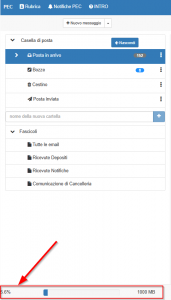 Ottobre 21, 2025 Come posso visualizzare lo spazio occupato della mia casella PEC configurata in Quadra? 0 Comments Per visualizzare lo spazio occupato è necessario accedere al CLIENT PEC. Una volta aperto, nella schermata principale, in basso a destra sarà visibile la percentuale di spazio utilizzato.