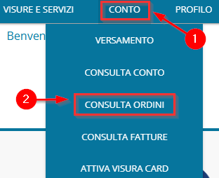 Dopo aver effettuato il login con le proprie credenziali, cliccare sulla voce CONTO (1) presente nel menù orizzontale in alto e, nel sotto elenco, CONSULTA ORDINI (2):