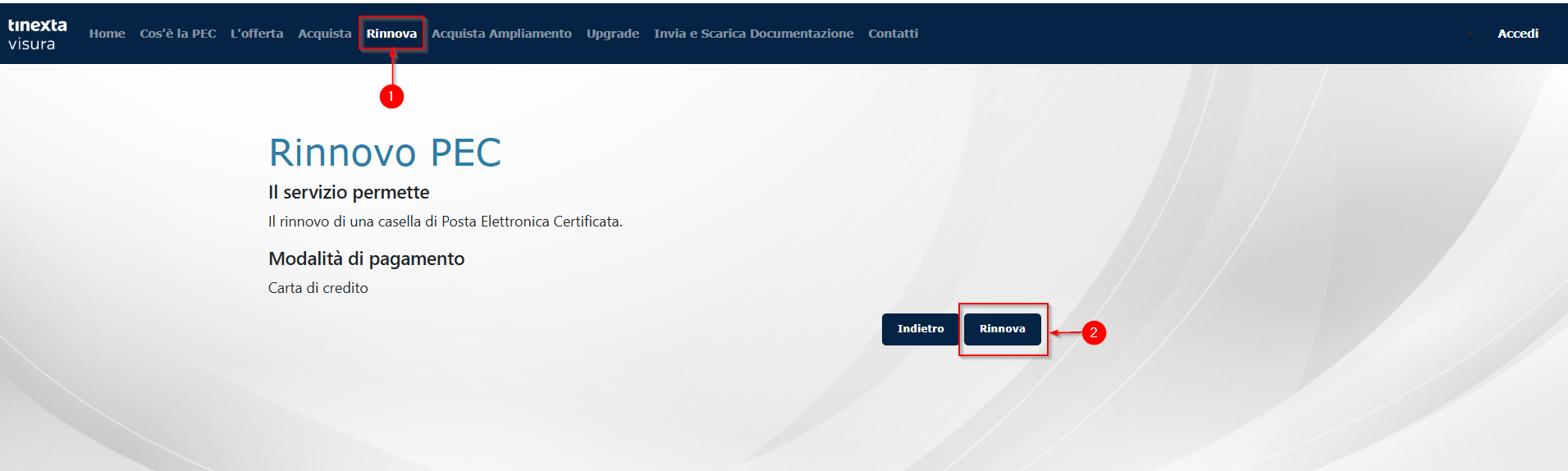 Collegarsi al sito www.visurapec.it , cliccare sull’apposita voce “rinnovo” (1) nel menù orizzontale in alto e, in basso a destra “Rinnova”