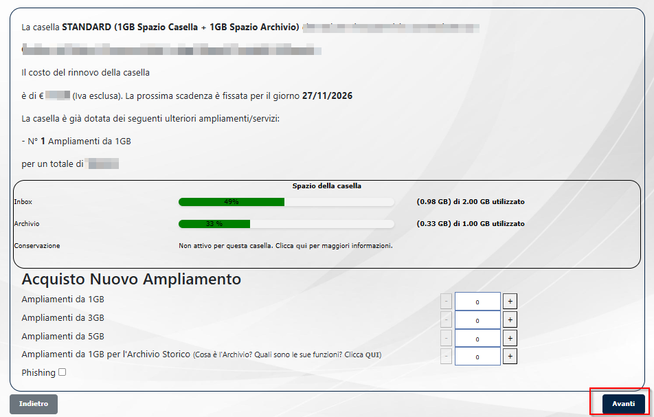 A video verranno visualizzati il costo del rinnovo, la data della prossima scadenza e la quota di memoria disponibile e occupata della casella PEC; qualora si desideri acquistare contestualmente eventuali ampliamenti di spazio, è sufficiente selezionare la quantità e la tipologia desiderate, altrimenti non selezionare nulla e cliccare su “Avanti” per procedere.