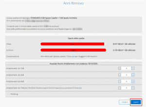A video verranno visualizzati il costo del rinnovo, la data della prossima scadenza e la quota di memoria disponibile e occupata della casella PEC; qualora si desideri acquistare contestualmente eventuali ampliamenti di spazio, è sufficiente selezionare la quantità e la tipologia desiderate, altrimenti non selezionare nulla e cliccare su “Avanti” per procedere.