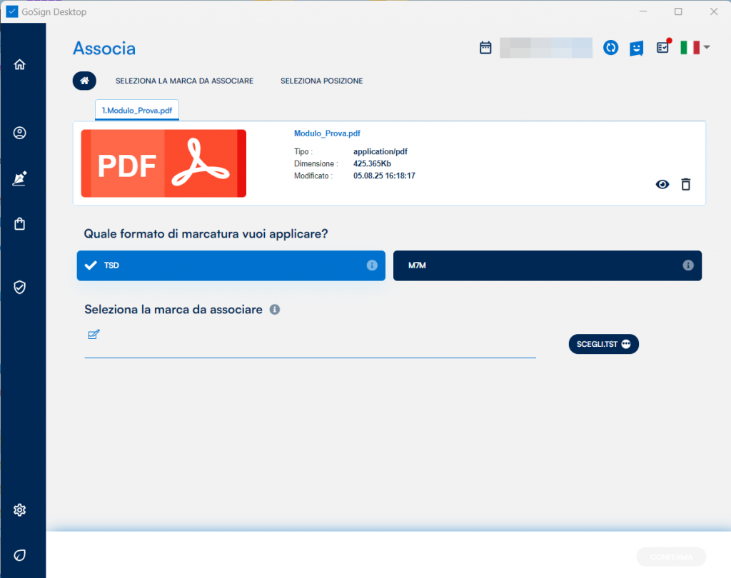 Una volta scelto, cliccando sul tasto CONFERMA, si verrà rindirizzati alla pagina conclusiva del processo di associazione dove bisognerà impostare dove salvare il documento marcato. Come sempre di default viene impostata la cartella nella quale è presente il documento originario e in base alla tipologia di marca selezionata restituirà un documento con estensione .m7m oppure .tsd.