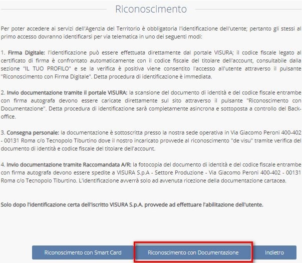 Nella pagina che si aprirà a video, il sistema chiederà di eseguire il riconoscimento. Cliccare sul tasto RICONOSCIMENTO CON DOCUMENTAZIONE: