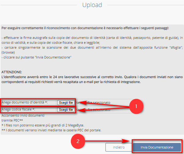 Allegare, dall’apposito tasto SFOGLIA (1) la fotocopia del documento di identità e del codice fiscale dell’intestatario dell’iscrizione firmati manualmente ed infine cliccare su INVIA DOCUMENTAZIONE (2):