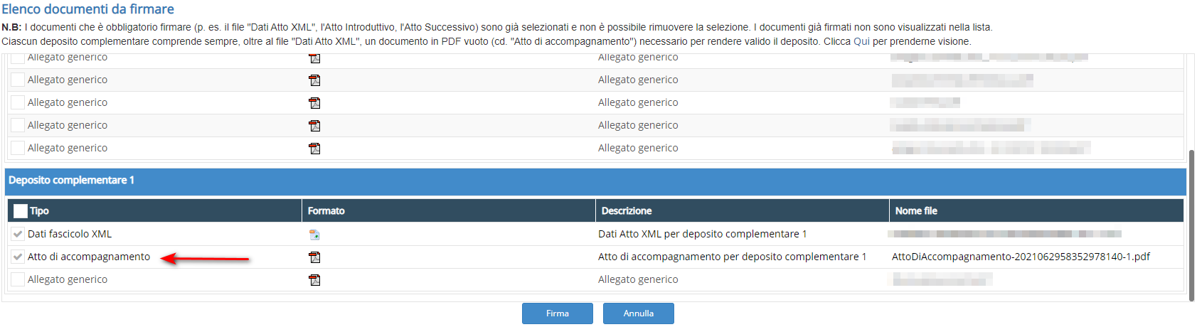 Per ogni deposito complementare, il sistema genera automaticamente un Documento di accompagnamento, ovvero un PDF nativo, che viene inserito come Atto principale.