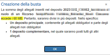 Quando il deposito supera i 60 MB, al momento della creazione della busta viene visualizzato il seguente messaggio: