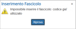 Il messaggio Codice già utilizzato compare quando, in fase di creazione del fascicolo, il sistema rileva che esiste già un fascicolo con lo stesso codice o nome.