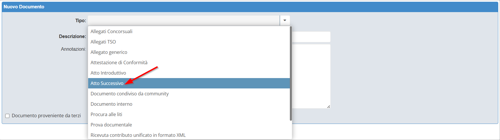 Se nella busta sono presenti solo allegati generici, sarà necessario aggiungere un nuovo documento, ad esempio una nota di deposito, classificandolo come Atto successivo, per poter completare la creazione della busta quindi procedere al suo invio.