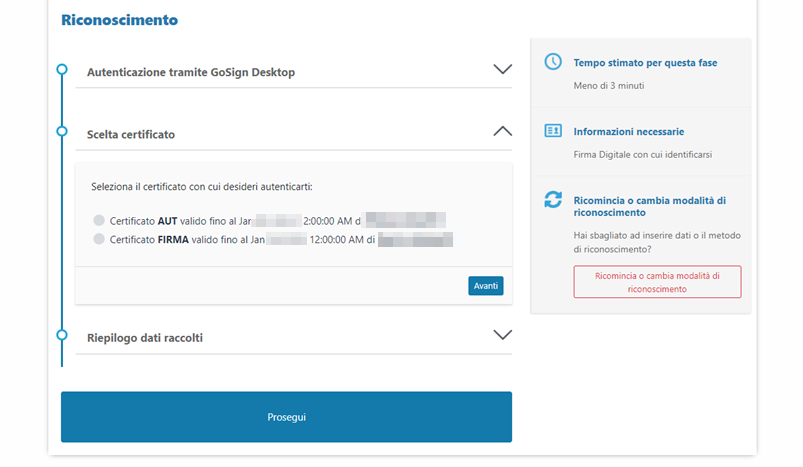 Ti consentirà di scegliere il certificato da utilizzare per il riconoscimento, cliccare su Avanti, si avvierà il GoSign Desktop ed inserire il pin.